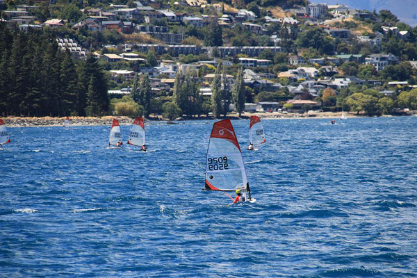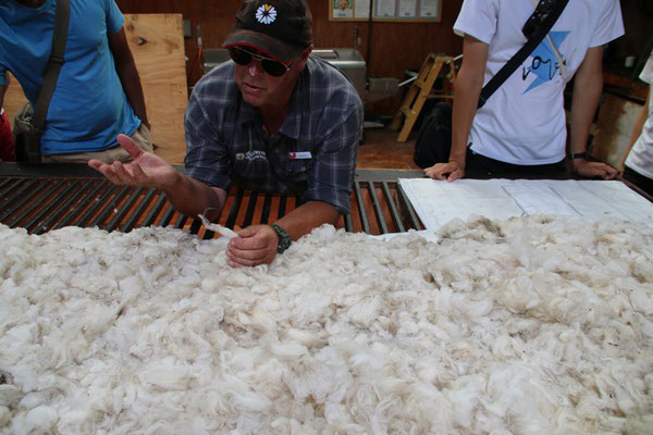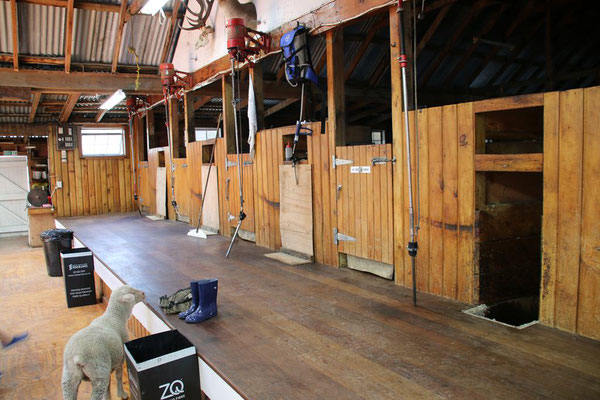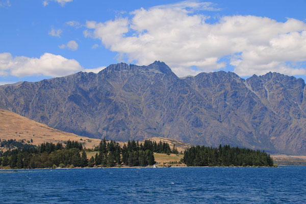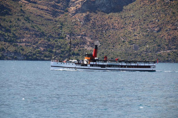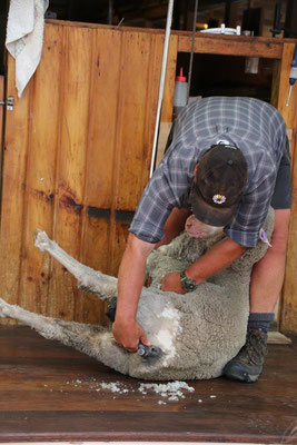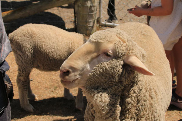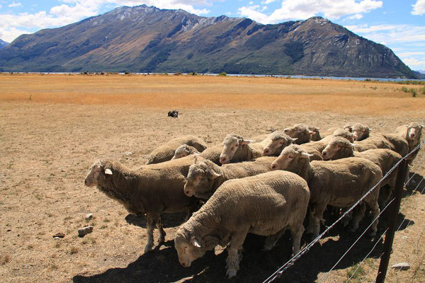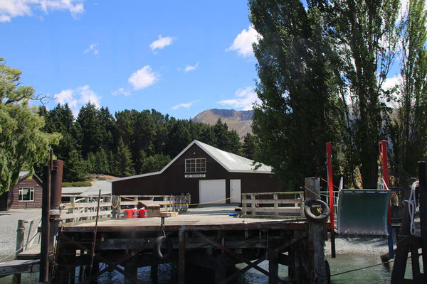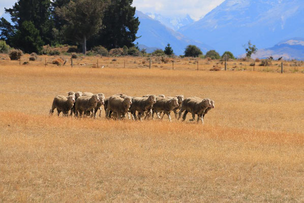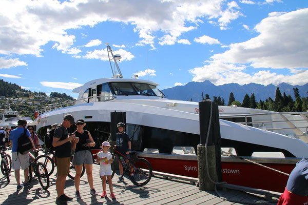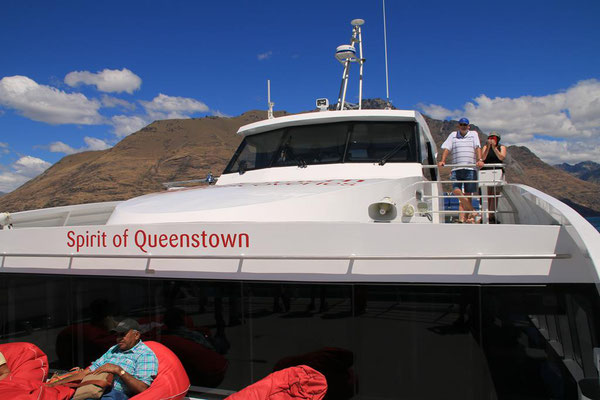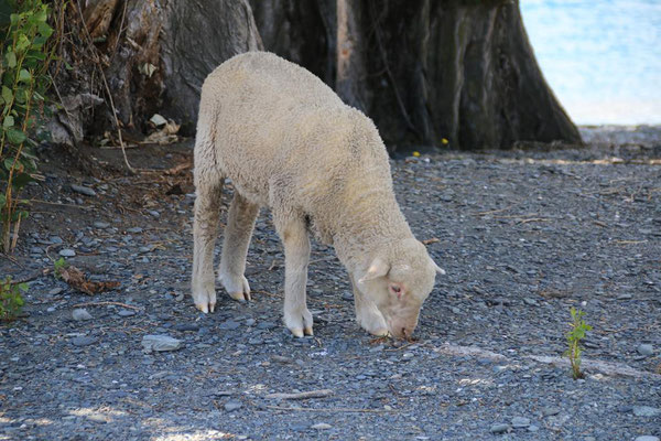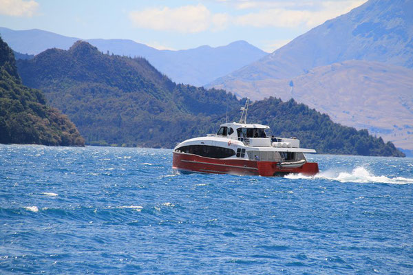 Die Fahrt mit der großen Katamaranfähre ist bei dem schönen Wetter sehr schön. Aber es geht ein heftiger Wind, so dass ich irgendwann mein Windjacke anziehe. Und das ist auch gut, denn plötzlich werden die Wellen so stark, dass ständig Gischt hochspritzt und uns auf dem zweiten Deck nass macht. Das sind die heftigen Fallwinde aus den hohen Bergen drum herum, die den See so aufwühlen. Nach einer dreiviertel Stunde erreichen wir die Farm Mount Nicholas. Hier begrüßt uns das Lämmchen Lucky. Wir werden durch einen älteren Schäfer herumgeführt und er zeigt uns die Arbeit mit den Hütehunden, von denen sie hier 45 Stück haben. Es ist die drittgrößte Farm der Südinsel mit 29000 Schafen und 900 Kühen. Es sind riesige Weideflächen, die uns zum Teil per Bus gezeigt werden. Auch die Lämmer und das Scheren der Schafe wird vorgeführt. Die Wolle der Merinoschafe, die sie hier züchten, ist sehr weich und voller Lanolin. Die Hände fühlen sich nach dem Anfassen der Wolle an wie eingecremt. Nach der Führung erhalten wir noch einen Lunch aus selbstgemachten Produkten, wie Wurst und Käse. Dazu Obst und Toastbrot (nicht selbstgemacht) sowie Kaffee. Das hatte ich gar nicht mitbekommen, dass das im Preis mit inbegriffen war. Aber sehr angenehm und vor allem lecker. Dann kommt auch schon die Fähre zurück und holt uns wieder ab. Nach dreieinhalb Stunden sind wir wieder in Queenstown am Anleger. Wir haben ein wenig Verspätung, da das Schiff kurz vor dem Anleger aufstoppt und ein große Gruppe junger Segler in ihren Optimisten vorbei lässt. Sehr sympatisch.