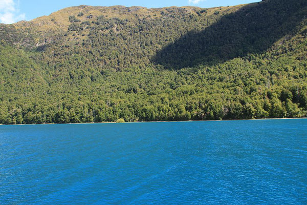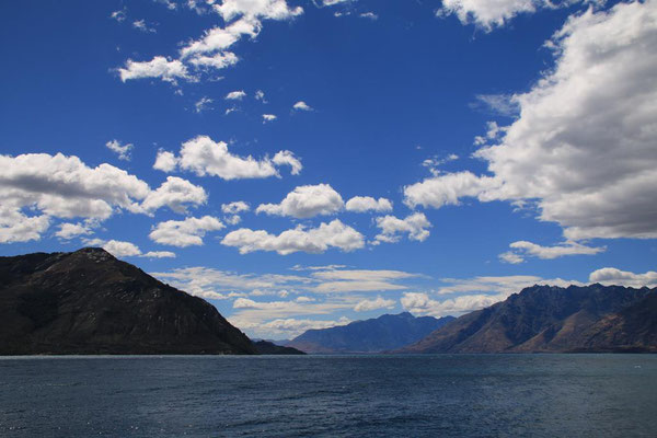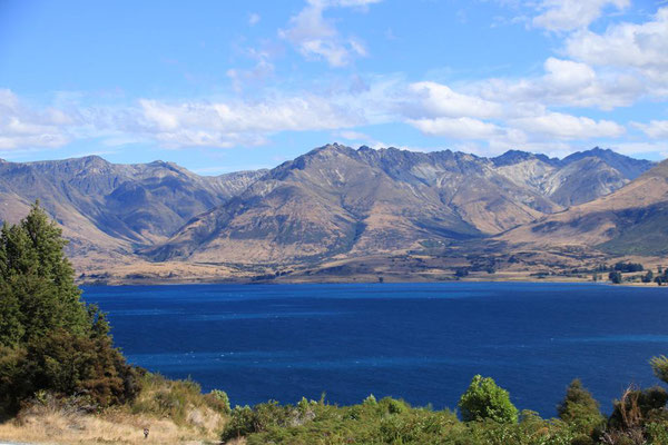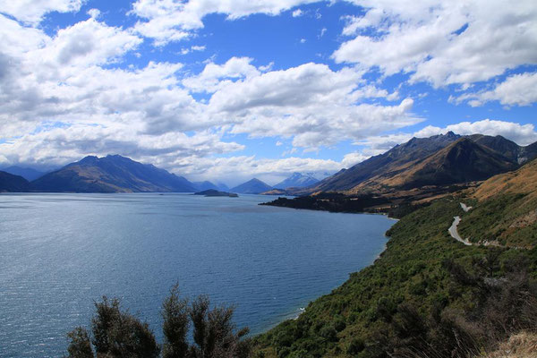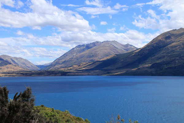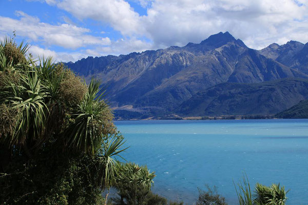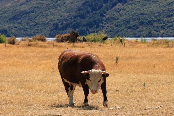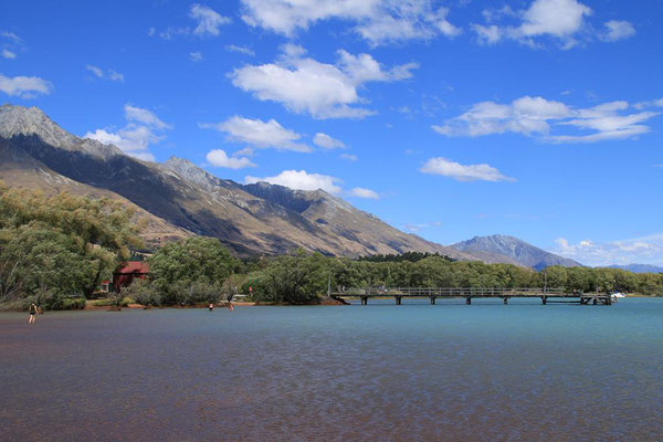 In meiner Planung ist heute noch eine Fahrt entlang des Sees nach Glenorchy. Der Lake Wakatipu ist der zweitgrößte See der Südinsel und mehr als 80 Kilometer lang und 5 Kilometer breit. Auch seine Tiefe ist mit 399 Metern beeindruckend. Und dazu die Farbe. Es ist wirklich zum Teil wie in der Karibik. Von tiefen Blau über hellere Töne bis zum Türkis. Er ist aber erfrischend kühl mit 17 ° und lockt mich daher nur mit den Füßen. Eine Besonderheit ist, dass der See "atmet". In regelmäßigen Abständen steigt und fällt sein Wasserspiegel durch den atmosphärischen Druck um bis zu 20 cm. Aber es ist nur am Rand an einigen Steinen zu sehen.
